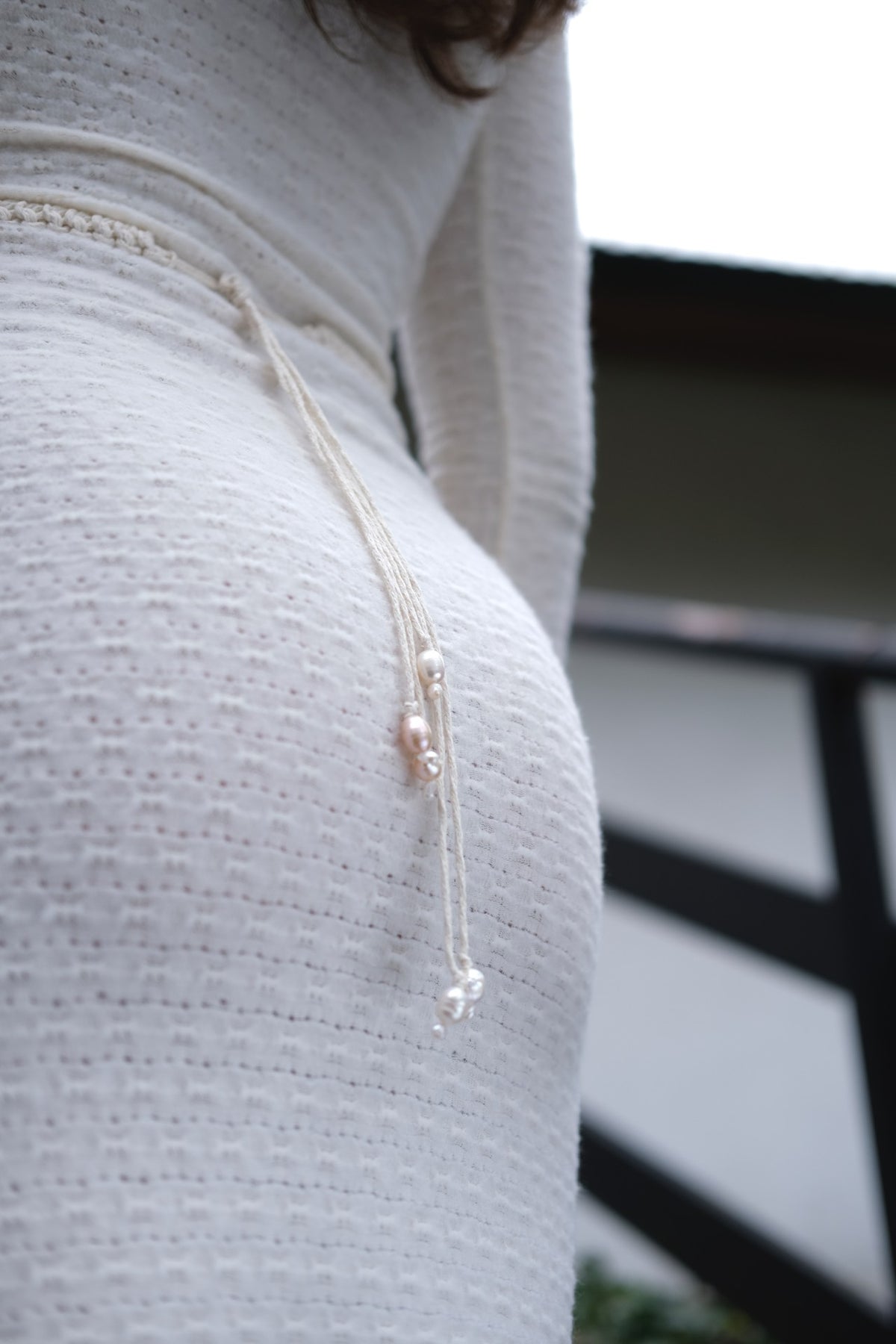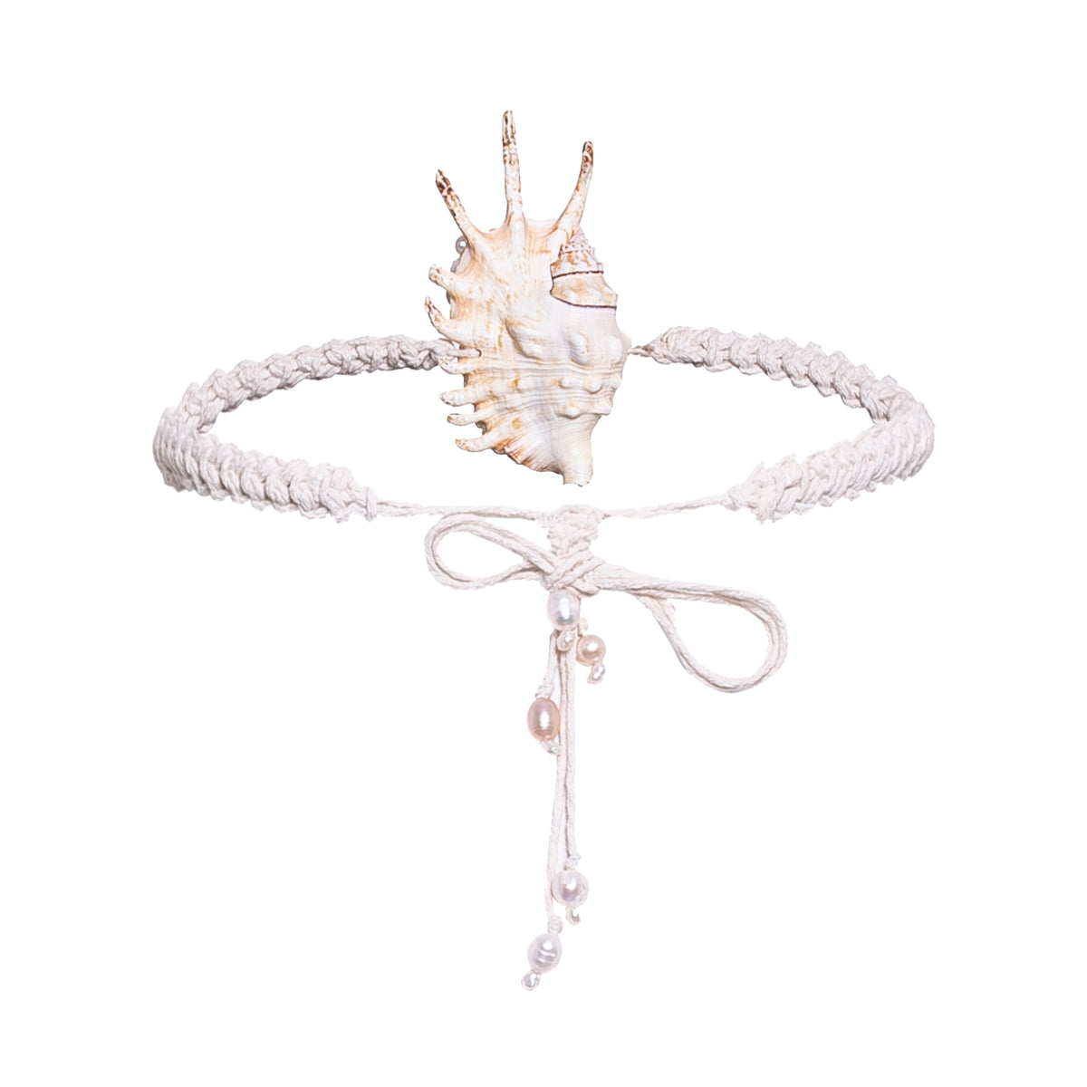 Handwoven from organic cotton, this statement belt features a striking "lanbis" seashell centerpiece encrusted with pearls and finished with a delicate pearl-trimmed back. An artisanal fusion of natural texture and organic opulence, it is designed to define the waist with a sophisticated, coastal-inspired elegance.
