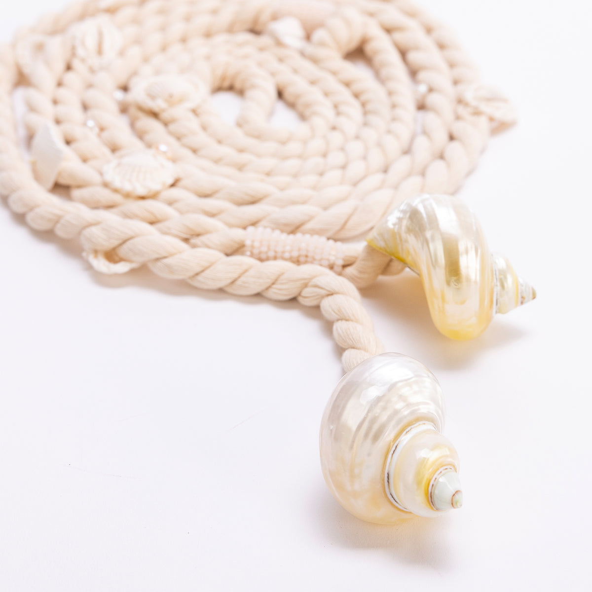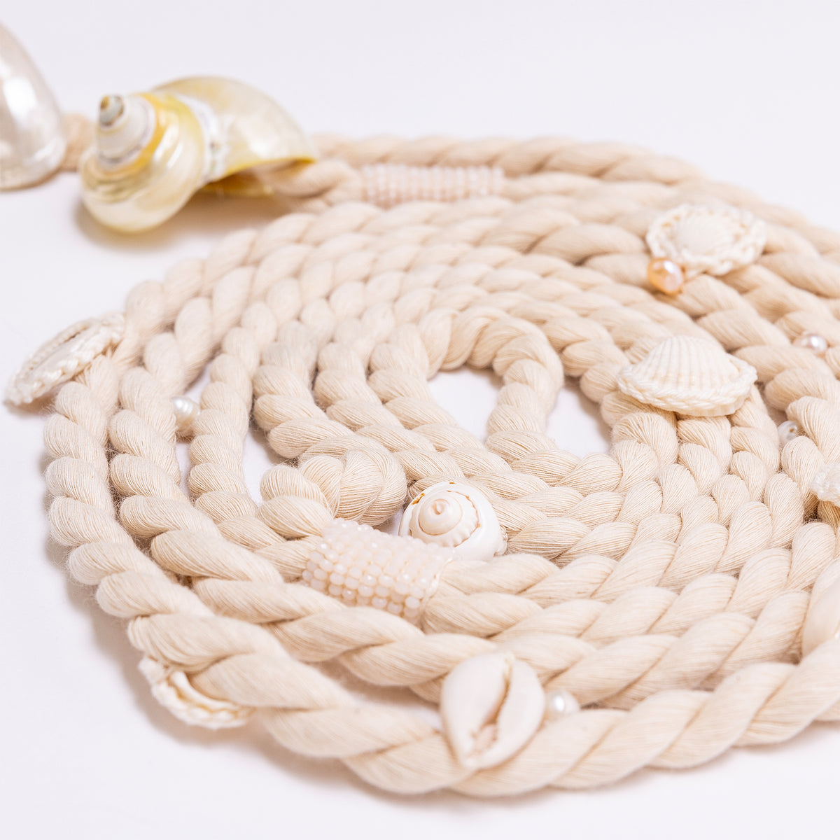 Handwoven from organic cotton, the H+S belt features a centerpiece of natural ''lanbis'' seashell encrusted with pearls. The back of the belt also has pearl finish
