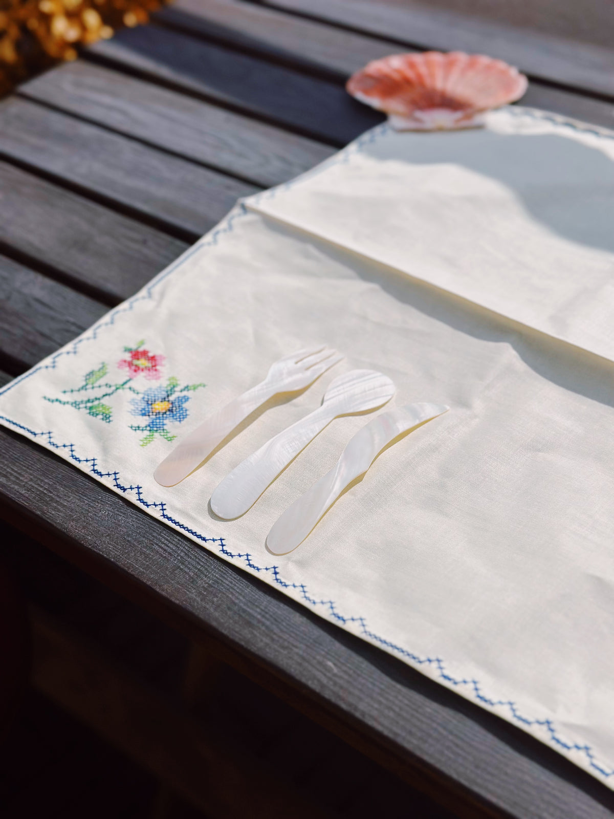 Elevate your Tide to Table experience with this exquisite, three-piece cutlery set. Hand-carved from luminous mother of pearl, each piece is a testament to organic elegance. Beyond its shimmering beauty, mother of pearl is the material of choice for the discerning host, as its non-reactive properties preserve the delicate, untainted flavor of fine delicacies like caviar and oysters.