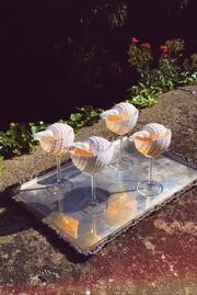 Elevate your next toast with our Shell Stemware—a breathtaking fusion of artisanal glasswork and oceanic treasure. Each glass features a unique, checkered Tonna tesselata sea shell perched elegantly atop a sleek glass stem. This ultra-special vessel is designed to transform any drink into a high-fashion occasion, bringing an air of sophisticated coastal glamour to your glassware collection.