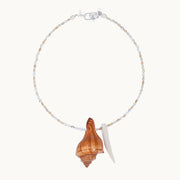 A sculptural masterpiece, the Sirinite Conch Neckpiece features the architectural silhouettes of natural conch and cone shells. Accented with luminous pearls and hand-polished shell beads, this piece is elegantly finished with sterling silver, embodying the refined glamour of Hide + Stone’s artisanal spirit.